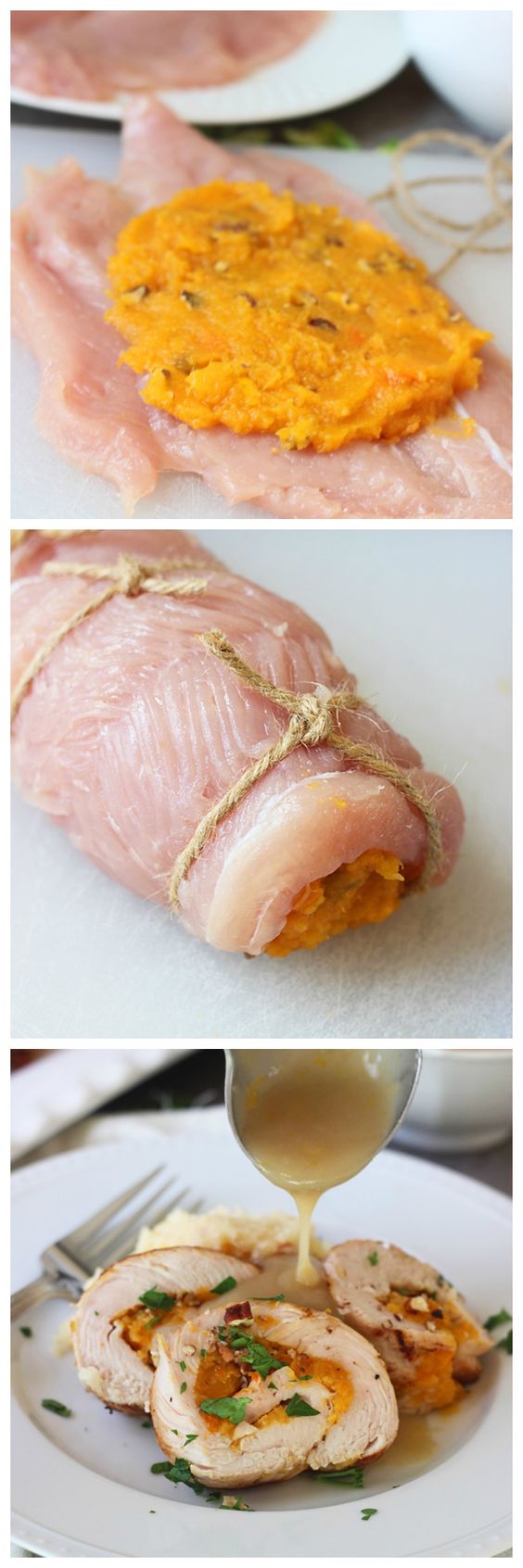 A csirkemelleket hosszában felszeljük, hogy vékony szeleteket kapjunk, és nagyon óvatosan (egy zacskón át) kissé kikloffoljuk. Sóval meghintjük, majd egyesével kiterítjük. A sütőben előre megsütött tököt a héjáról elválasztjuk és egy tálban villával összenyomkodjuk, egy deci forró vízzel felöntjük, sóval és borssal, valamint a leveskockával ízesítjük, végül a diót is beleforgatjuk. Ha a kapott állag nem krémes, pástétom-szerű, akkor vízzel higíthatjuk, vagy liszttel sűríthetjük. A kapott krémet evőkanállal a kiterített csirkemellekre adagoljuk, óvatosan felgöngyölítjük és leforrázott cérnával, vagy fogpiszkálóval rögzítjük. Ezt követően kiolajozott tepsire tesszük és 25 perc alatt készre sütjük.