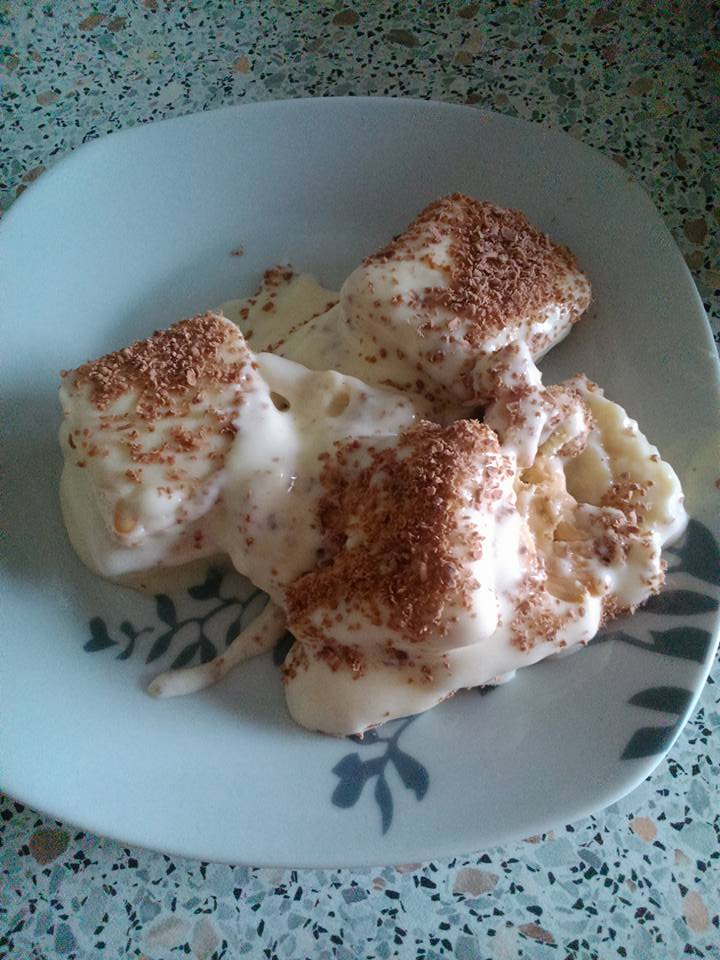 Ezalatt a tejet felmelegítjük, a cukrot felolvasztjuk benne, majd a zacskó utasításait követve elkészítjük a pudingot. (Én a port a meleg tejből kimért 2 deciben kevertem ki, hogy ne legyen csomós). Mikor a puding már sűrű, egy merőkanállal lassan adagolva elfedjük a kekszeket, és rögtön egy következő emeletet rakunk ki.